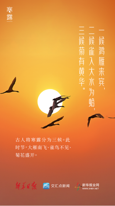 “九月节,露气寒冷,将凝结也。”寒露是二十四节气中的第十七个节气,也是秋季的第五个节气。进入寒露,作别秋高气爽,天气由此转寒,露水从初秋透着些微凉意,转为深秋浸润着几许寒冷,此时气温较白露时更低,露水更多,秋意亦更浓。