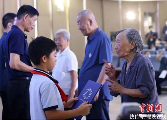 南京大屠杀幸存者夏淑琴(右一)、葛道荣(右二)、艾义英(右三)向南京大屠杀幸存者后代代表颁发“南京大屠杀历史记忆传承人”证书。泱波 摄