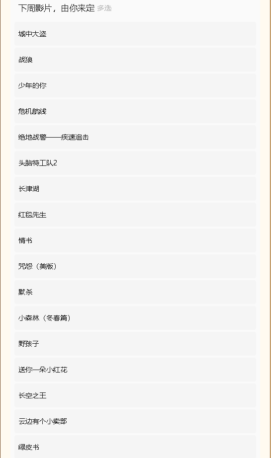 根据同学们的留言,小图整理了参与下周电影播放投票的影片,未选中的为无官方资源或未上映的影片,得票第一的电影将会在下周三播放,欢迎各位参与投票的同学来馆观看电影。
