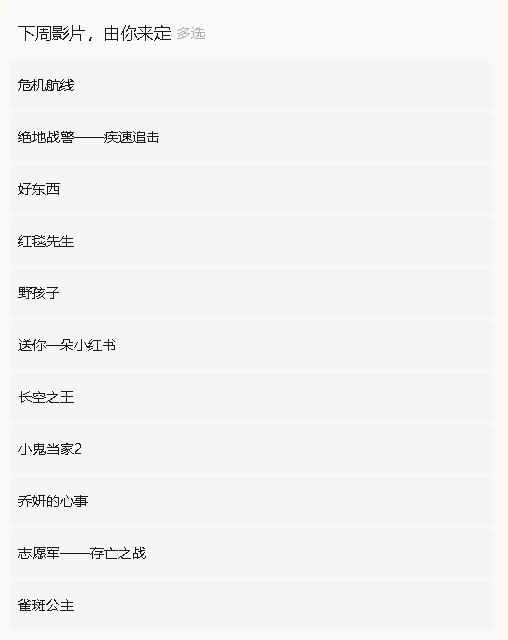 根据同学们的留言,小图整理了参与下周电影播放投票的影片,未选中的为无官方资源或未上映的影片,得票第一的电影将会在下周三播放,欢迎各位参与投票的同学来馆观看电影。