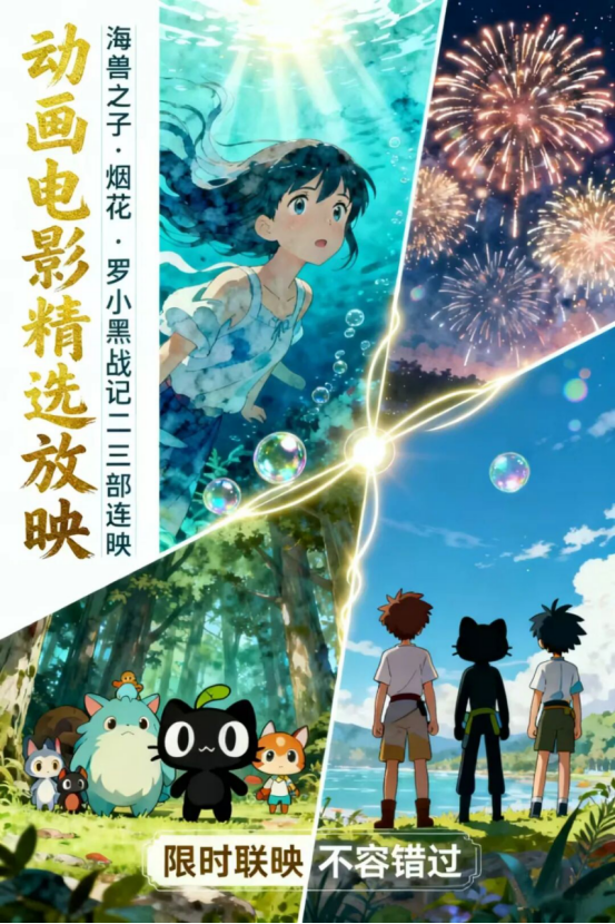下周又是每月一次的电影连播啦~这次播放的三部电影是:《海兽之子》《烟花》《罗小黑战记2》